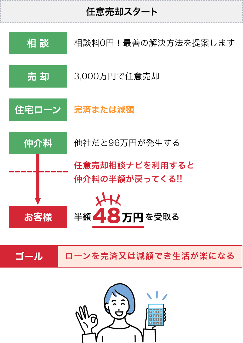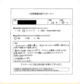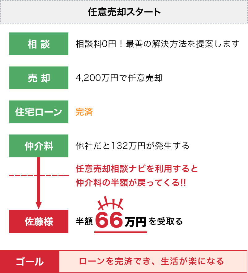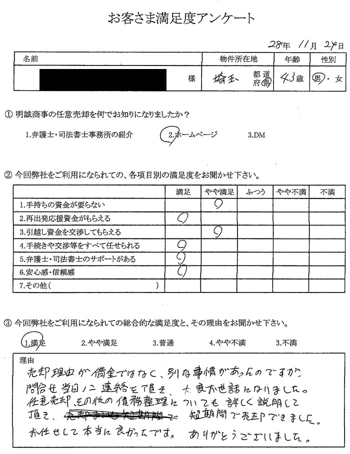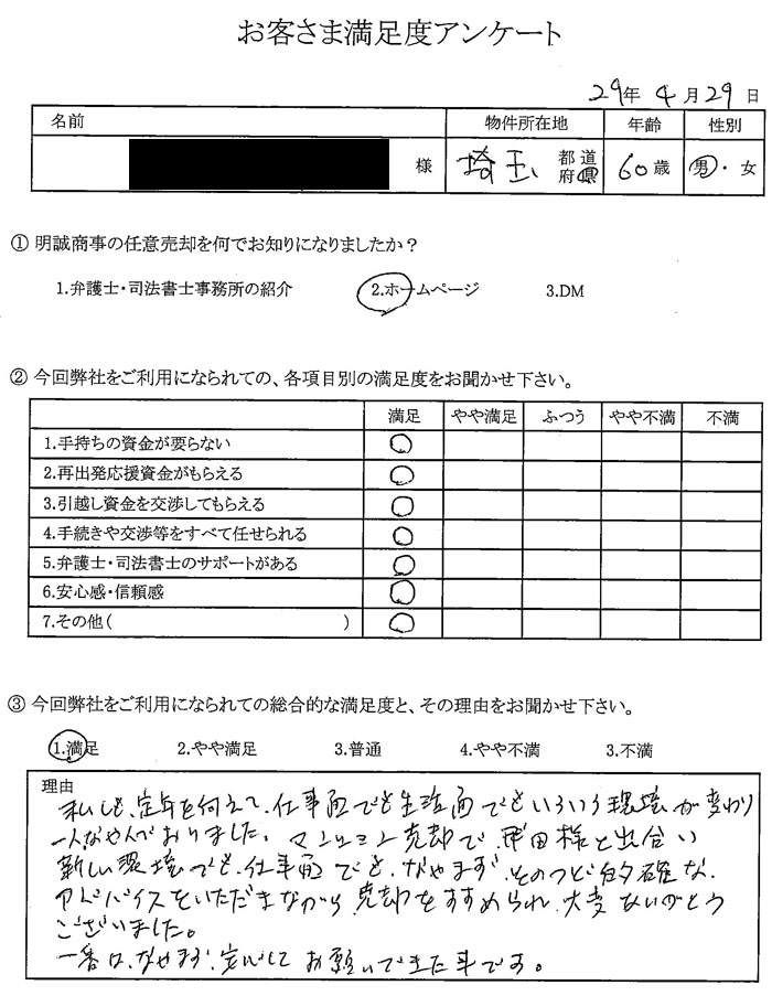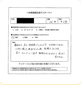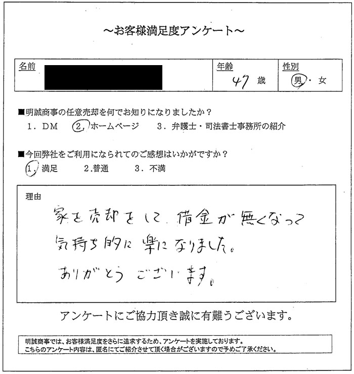 自宅近くのファミリーレストランで面談をさせて頂き、任意売却のメリット・デメリット、借金問題を解決する方法や自己破産を回避する方法を分かり易く教えてもらい、これなら何とかできると、少し安心しました。
